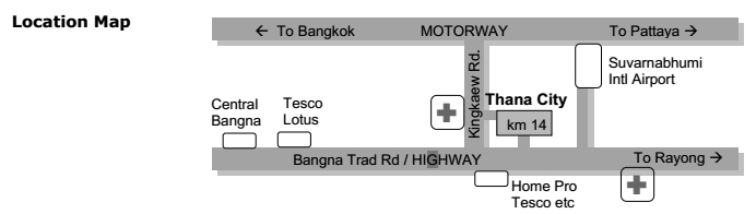 Bangna Trad Highway and a recent completed Motorway not only provides guests with excellent connections from Thanacity to Central Bangkok and to International Airport, but also provides convenience access to the popular regions of Lamchabang, Rayong and Pattaya.